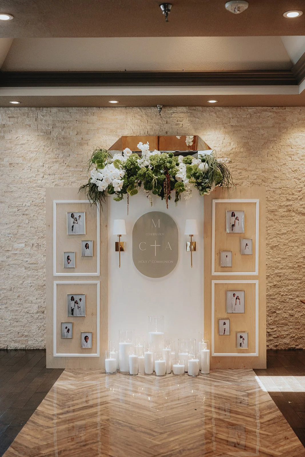 From the moment guests arrived, the experience was intentional. The entrance was designed to set the tone—welcoming, serene, and full of grace. A beautifully curated welcome sign stood tall, adorned with lush florals cascading from the top, and featured touching portraits of each child being honored. Candlelit sconces and warm lighting guided guests inside, offering a sense of reverence and wonder as they approached the ballroom.