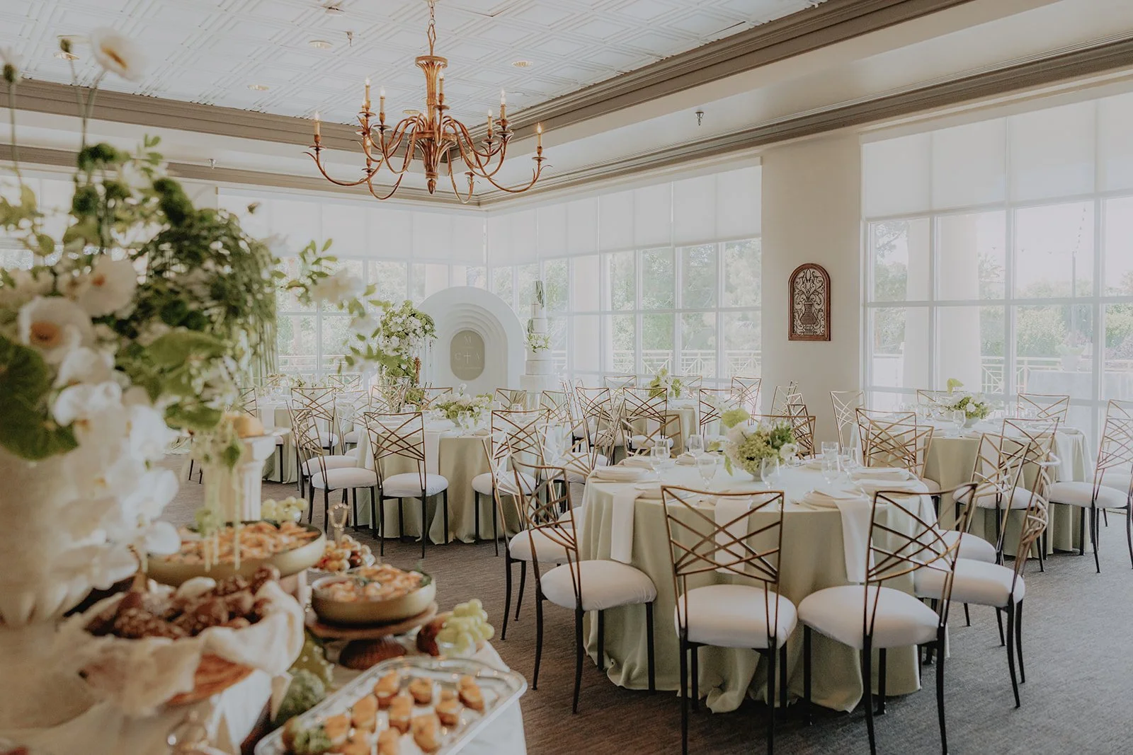 The centerpiece of the ballroom greeted guests with a grazing table that was not only artfully curated but visually spectacular. Elevated gold platters held perfectly chilled shrimp skewers, delicately arranged over ice and garnished with fresh dill, paired with vibrant cocktail sauce for a fresh and indulgent start. Nearby, towers of cheese cubes rested against a bed of salami and crisp grapes, nestled into half wheels of parmesan for a rustic-luxe presentation.