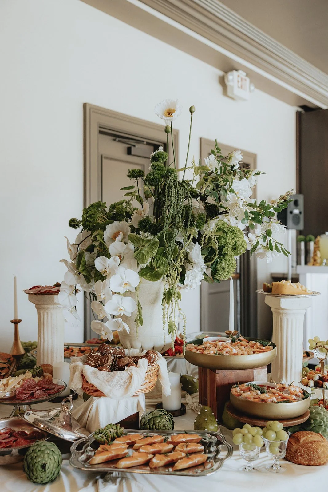 Every tray, pedestal, and garnish was placed with intention. From the artful charcuterie stacks to the classical column risers and gilded candlesticks, this table told a story of sacred celebration, timeless elegance, and a love for the details that make gatherings unforgettable.
