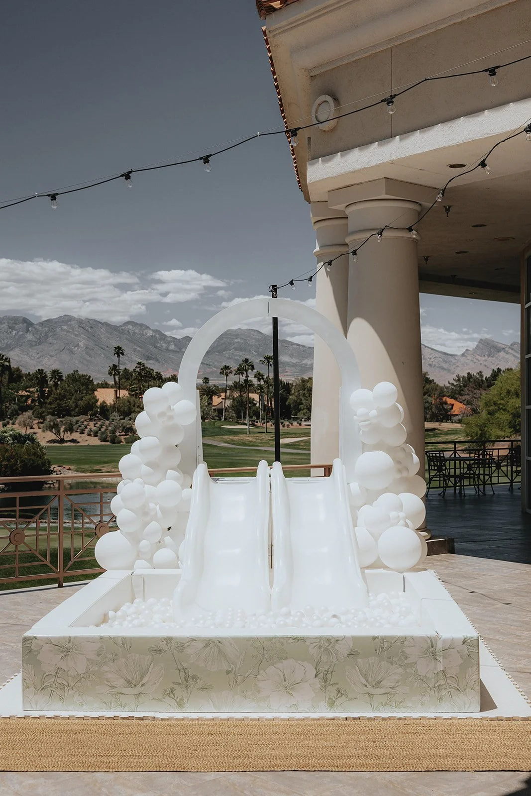Of course, no family celebration is complete without a little fun for the youngest guests. A white bounce house decked in balloons offered joyful play, while a custom ball pit with a matching floral motif extended the event’s design seamlessly into the kids’ area. Out on the patio, vintage-inspired cocktail tables and whimsical centerpieces overlooked the golf course, creating a serene escape for guests to mingle. To cool off, everyone enjoyed handcrafted paletas—mangonada, lime, and strawberry—served from a charming paleta bar that became a guest favorite.