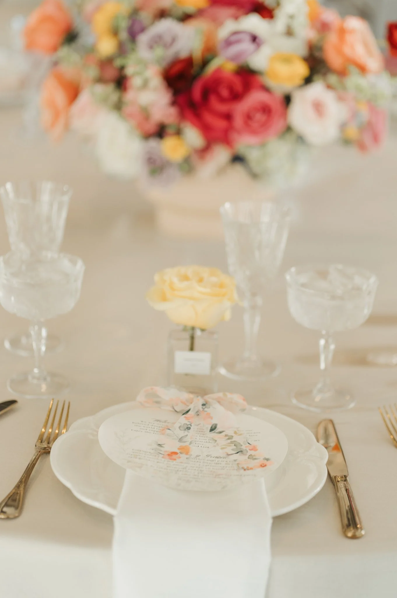 The ballroom was transformed into a fairy-tale venue, reflecting Dior’s signature elegance. A lush greenery chandelier cast a soft, enchanting glow over tables draped in white linens, each adorned with towering floral arrangements in summer hues. Delicate crystal centerpieces and perfume bottle-inspired place settings added a personalized touch, while golden accents and charming bows tied everything together, reflecting Mia’s love for these elegant details.